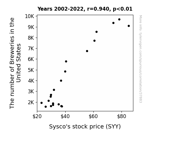This means 88.4% of the change in the one variable (i.e., Sysco's stock price (SYY)) is predictable based on the change in the other (i.e., The number of Breweries in the United States) over the 21 years from 2002 through 2022.
