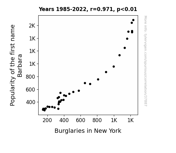 This means 94.4% of the change in the one variable (i.e., Burglaries in New York) is predictable based on the change in the other (i.e., Popularity of the first name Barbara) over the 38 years from 1985 through 2022.