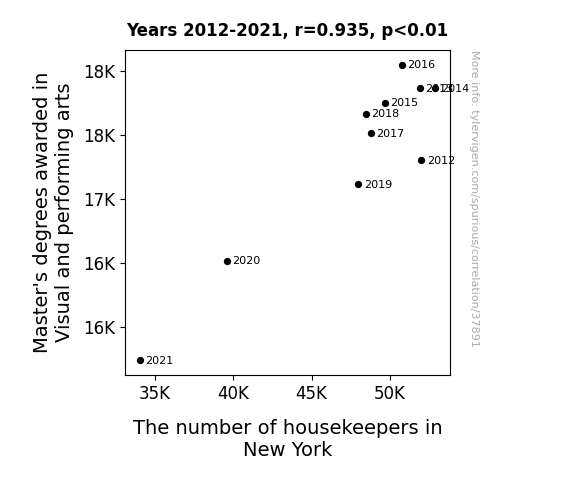 This means 87.5% of the change in the one variable (i.e., The number of housekeepers in New York) is predictable based on the change in the other (i.e., Master's degrees awarded in Visual and performing arts) over the 10 years from 2012 through 2021.