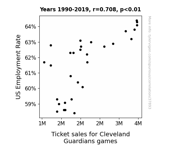 This means 50.2% of the change in the one variable (i.e., Ticket sales for Cleveland Guardians games) is predictable based on the change in the other (i.e., US Employment Rate) over the 30 years from 1990 through 2019.
