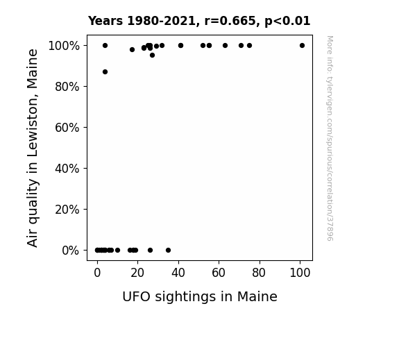 This means 44.3% of the change in the one variable (i.e., UFO sightings in Maine) is predictable based on the change in the other (i.e., Air quality in Lewiston, Maine) over the 42 years from 1980 through 2021.