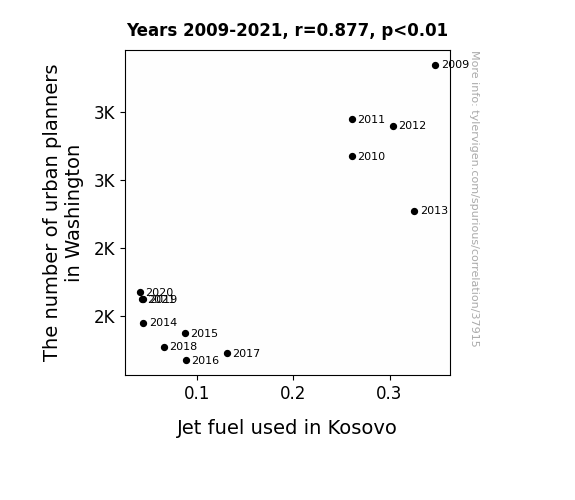 This means 76.9% of the change in the one variable (i.e., Jet fuel used in Kosovo) is predictable based on the change in the other (i.e., The number of urban planners in Washington) over the 13 years from 2009 through 2021.