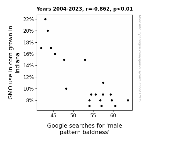This means 74.3% of the change in the one variable (i.e., Google searches for 'male pattern baldness') is predictable based on the change in the other (i.e., GMO use in corn grown in Indiana) over the 20 years from 2004 through 2023.