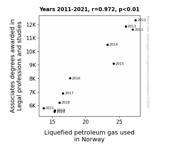 This means 94.5% of the change in the one variable (i.e., Liquefied petroleum gas used in Norway) is predictable based on the change in the other (i.e., Associates degrees awarded in Legal professions and studies) over the 11 years from 2011 through 2021.
