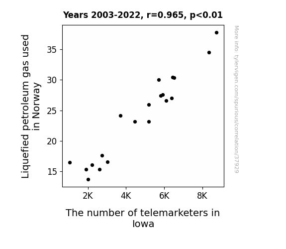 This means 93.1% of the change in the one variable (i.e., The number of telemarketers in Iowa) is predictable based on the change in the other (i.e., Liquefied petroleum gas used in Norway) over the 20 years from 2003 through 2022.