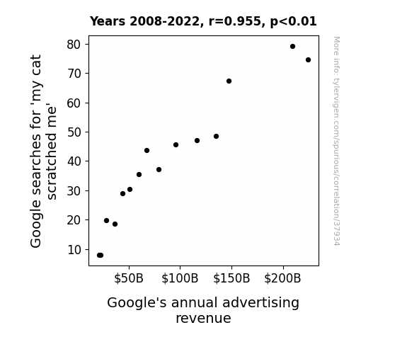 This means 91.2% of the change in the one variable (i.e., Google's annual advertising revenue) is predictable based on the change in the other (i.e., Google searches for 'my cat scratched me') over the 15 years from 2008 through 2022.