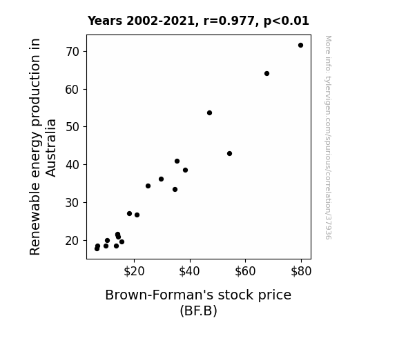 This means 95.5% of the change in the one variable (i.e., Brown-Forman's stock price (BF.B)) is predictable based on the change in the other (i.e., Renewable energy production in Australia) over the 20 years from 2002 through 2021.
