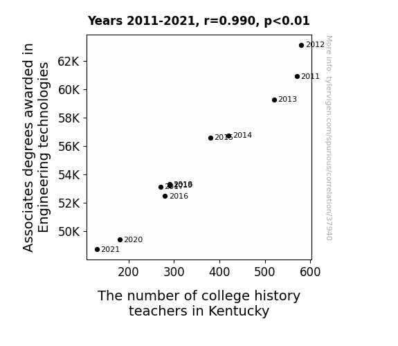 This means 98.1% of the change in the one variable (i.e., The number of college history teachers in Kentucky) is predictable based on the change in the other (i.e., Associates degrees awarded in Engineering technologies) over the 11 years from 2011 through 2021.