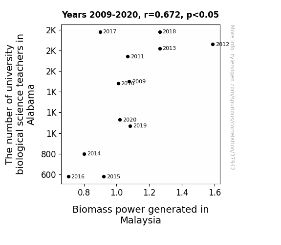 This means 45.1% of the change in the one variable (i.e., Biomass power generated in Malaysia) is predictable based on the change in the other (i.e., The number of university biological science teachers in Alabama) over the 12 years from 2009 through 2020.