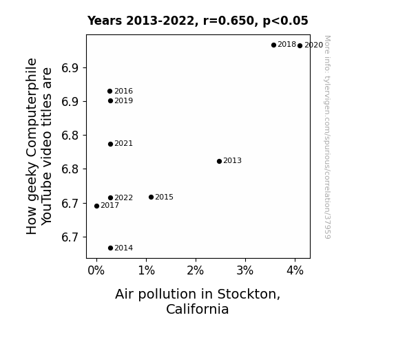 This means 42.2% of the change in the one variable (i.e., Air pollution in Stockton, California) is predictable based on the change in the other (i.e., How geeky Computerphile YouTube video titles are) over the 10 years from 2013 through 2022.