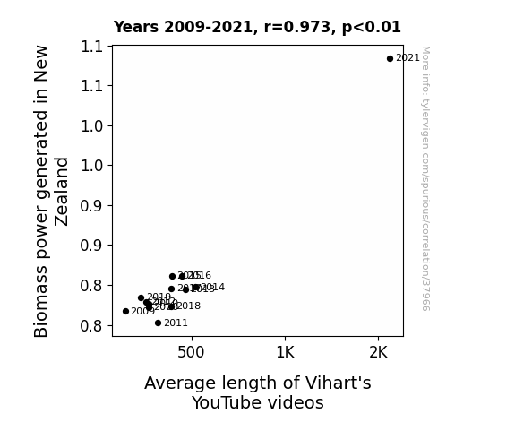 This means 94.6% of the change in the one variable (i.e., Average length of Vihart's YouTube videos) is predictable based on the change in the other (i.e., Biomass power generated in New Zealand) over the 13 years from 2009 through 2021.