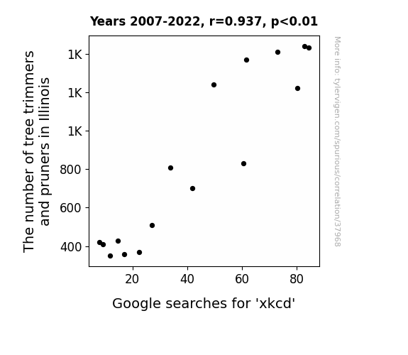 This means 87.8% of the change in the one variable (i.e., Google searches for 'xkcd') is predictable based on the change in the other (i.e., The number of tree trimmers and pruners in Illinois) over the 16 years from 2007 through 2022.