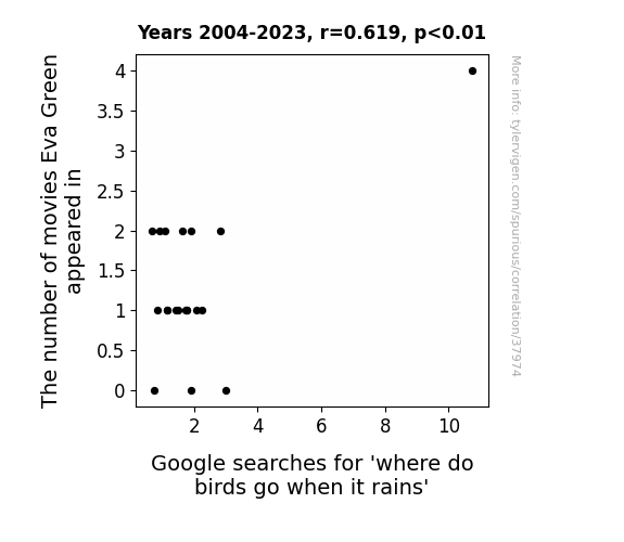 This means 38.3% of the change in the one variable (i.e., Google searches for 'where do birds go when it rains') is predictable based on the change in the other (i.e., The number of movies Eva Green appeared in) over the 20 years from 2004 through 2023.