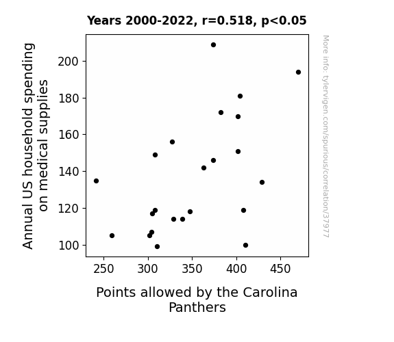 This means 26.8% of the change in the one variable (i.e., Points allowed by the Carolina Panthers) is predictable based on the change in the other (i.e., Annual US household spending on medical supplies) over the 23 years from 2000 through 2022.