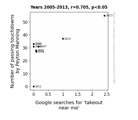 This means 49.6% of the change in the one variable (i.e., Google searches for 'takeout near me') is predictable based on the change in the other (i.e., Number of passing touchdowns by Peyton Manning) over the 9 years from 2005 through 2013.