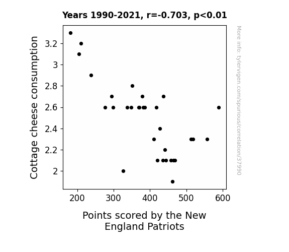 This means 49.4% of the change in the one variable (i.e., Points scored by the New England Patriots) is predictable based on the change in the other (i.e., Cottage cheese consumption) over the 32 years from 1990 through 2021.