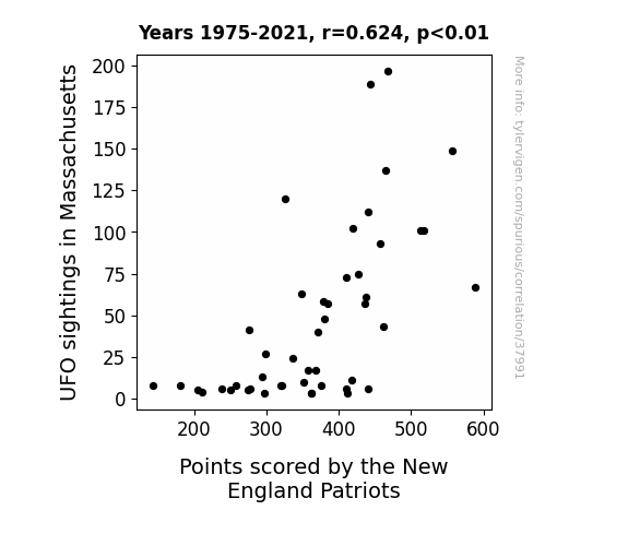 This means 38.9% of the change in the one variable (i.e., Points scored by the New England Patriots) is predictable based on the change in the other (i.e., UFO sightings in Massachusetts) over the 47 years from 1975 through 2021.