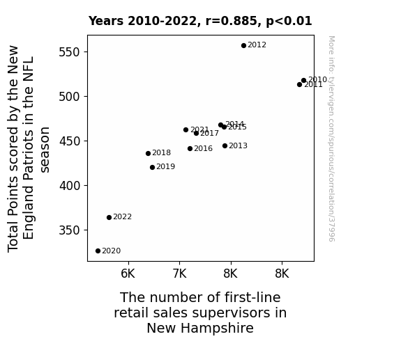 This means 78.3% of the change in the one variable (i.e., The number of first-line retail sales supervisors in New Hampshire) is predictable based on the change in the other (i.e., Total Points scored by the New England Patriots in the NFL season) over the 13 years from 2010 through 2022.