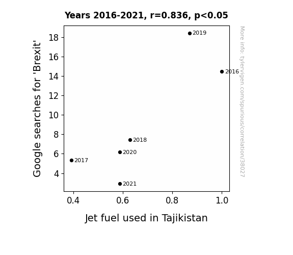 This means 69.8% of the change in the one variable (i.e., Jet fuel used in Tajikistan) is predictable based on the change in the other (i.e., Google searches for 'Brexit') over the 6 years from 2016 through 2021.