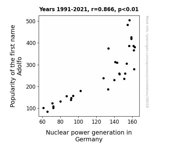 This means 74.9% of the change in the one variable (i.e., Nuclear power generation in Germany) is predictable based on the change in the other (i.e., Popularity of the first name Adolfo) over the 31 years from 1991 through 2021.