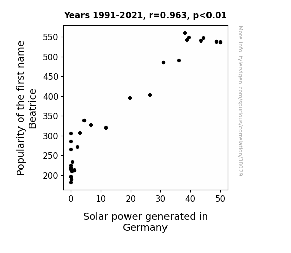 This means 92.7% of the change in the one variable (i.e., Solar power generated in Germany) is predictable based on the change in the other (i.e., Popularity of the first name Beatrice) over the 31 years from 1991 through 2021.