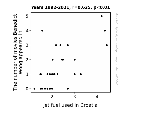 This means 39.1% of the change in the one variable (i.e., Jet fuel used in Croatia) is predictable based on the change in the other (i.e., The number of movies Benedict Wong appeared in) over the 30 years from 1992 through 2021.