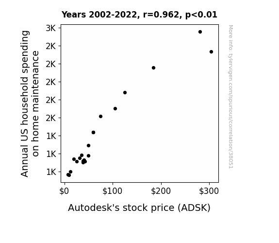 This means 92.6% of the change in the one variable (i.e., Autodesk's stock price (ADSK)) is predictable based on the change in the other (i.e., Annual US household spending on home maintenance) over the 21 years from 2002 through 2022.