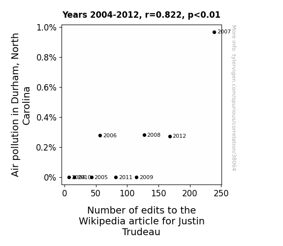 This means 67.5% of the change in the one variable (i.e., Number of edits to the Wikipedia article for Justin Trudeau) is predictable based on the change in the other (i.e., Air pollution in Durham, North Carolina) over the 9 years from 2004 through 2012.