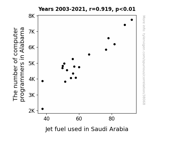 This means 84.4% of the change in the one variable (i.e., Jet fuel used in Saudi Arabia) is predictable based on the change in the other (i.e., The number of computer programmers in Alabama) over the 19 years from 2003 through 2021.