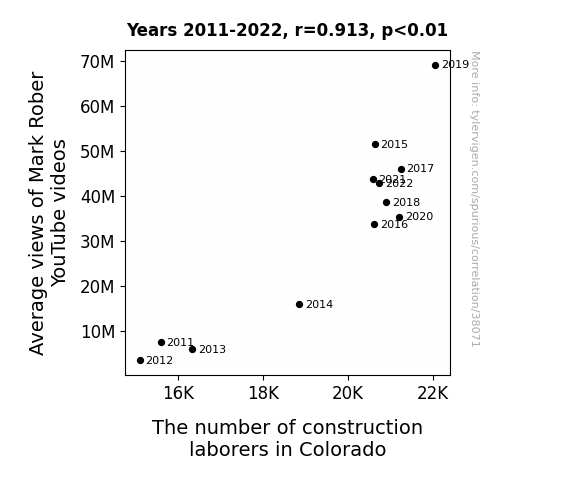 This means 83.3% of the change in the one variable (i.e., The number of construction laborers in Colorado) is predictable based on the change in the other (i.e., Average views of Mark Rober YouTube videos) over the 12 years from 2011 through 2022.