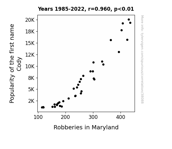 This means 92.1% of the change in the one variable (i.e., Robberies in Maryland) is predictable based on the change in the other (i.e., Popularity of the first name Cody) over the 38 years from 1985 through 2022.