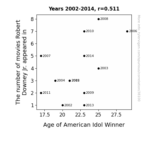 This means 26.1% of the change in the one variable (i.e., Age of American Idol Winner) is predictable based on the change in the other (i.e., The number of movies Robert Downey Jr. appeared in) over the 13 years from 2002 through 2014.