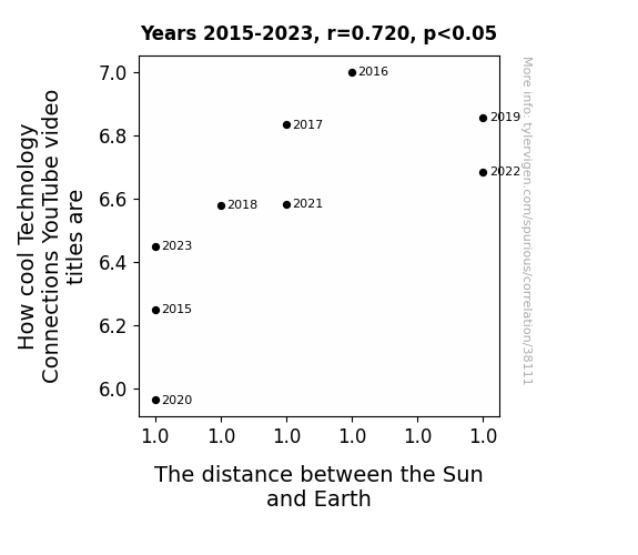 This means 51.8% of the change in the one variable (i.e., The distance between the Sun and Earth) is predictable based on the change in the other (i.e., How cool Technology Connections YouTube video titles are) over the 9 years from 2015 through 2023.