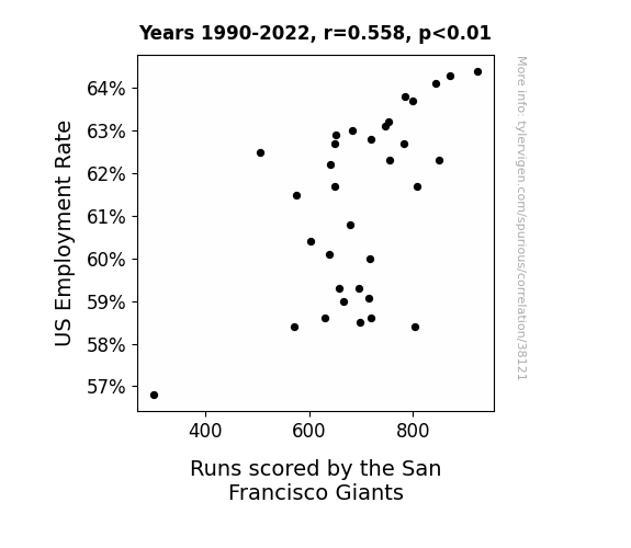 This means 31.1% of the change in the one variable (i.e., Runs scored by the San Francisco Giants) is predictable based on the change in the other (i.e., US Employment Rate) over the 33 years from 1990 through 2022.