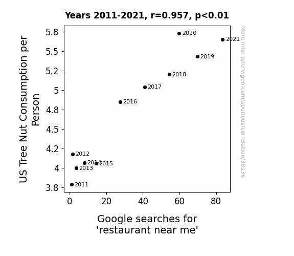 This means 91.6% of the change in the one variable (i.e., Google searches for 'restaurant near me') is predictable based on the change in the other (i.e., US Tree Nut Consumption per Person) over the 11 years from 2011 through 2021.