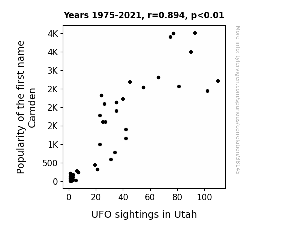 This means 80% of the change in the one variable (i.e., UFO sightings in Utah) is predictable based on the change in the other (i.e., Popularity of the first name Camden) over the 47 years from 1975 through 2021.