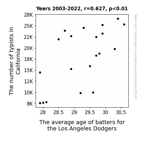 This means 39.3% of the change in the one variable (i.e., The average age of batters for the Los Angeles Dodgers) is predictable based on the change in the other (i.e., The number of typists in California) over the 20 years from 2003 through 2022.