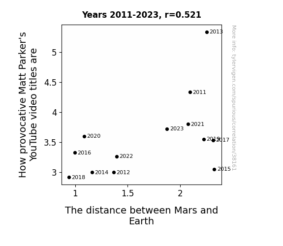 This means 27.1% of the change in the one variable (i.e., The distance between Mars and Earth) is predictable based on the change in the other (i.e., How provocative Matt Parker's YouTube video titles are) over the 13 years from 2011 through 2023.