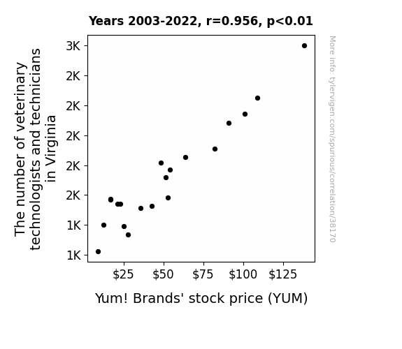 This means 91.4% of the change in the one variable (i.e., Yum! Brands' stock price (YUM)) is predictable based on the change in the other (i.e., The number of veterinary technologists and technicians in Virginia) over the 20 years from 2003 through 2022.