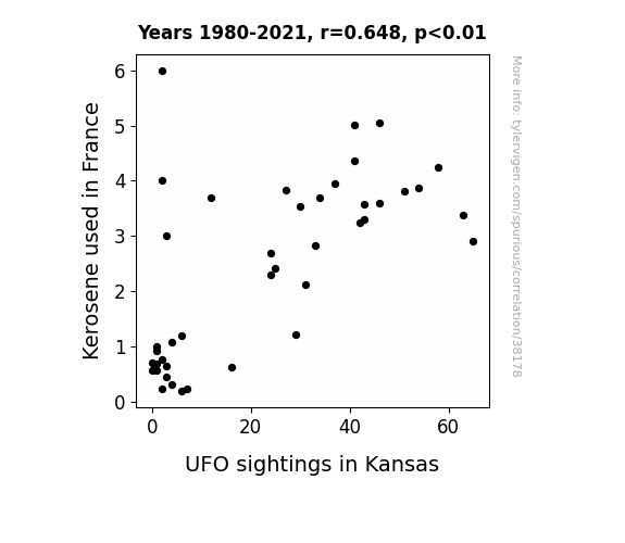 This means 42% of the change in the one variable (i.e., UFO sightings in Kansas) is predictable based on the change in the other (i.e., Kerosene used in France) over the 42 years from 1980 through 2021.