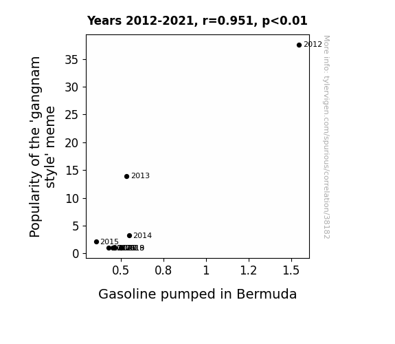 This means 90.5% of the change in the one variable (i.e., Gasoline pumped in Bermuda) is predictable based on the change in the other (i.e., Popularity of the 'gangnam style' meme) over the 10 years from 2012 through 2021.