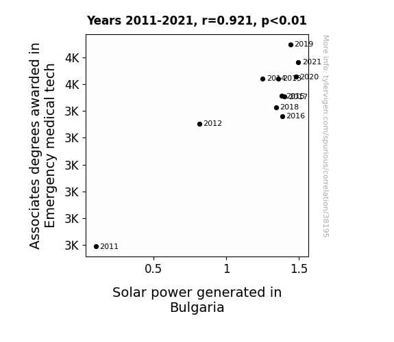 This means 84.8% of the change in the one variable (i.e., Solar power generated in Bulgaria) is predictable based on the change in the other (i.e., Associates degrees awarded in Emergency medical tech) over the 11 years from 2011 through 2021.