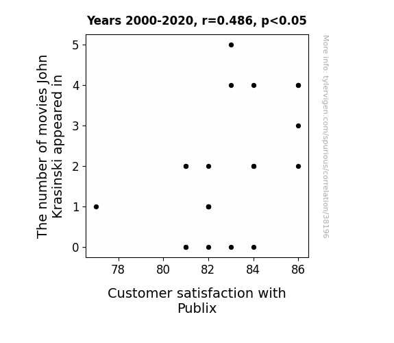 This means 23.6% of the change in the one variable (i.e., Customer satisfaction with Publix) is predictable based on the change in the other (i.e., The number of movies John Krasinski appeared in) over the 21 years from 2000 through 2020.