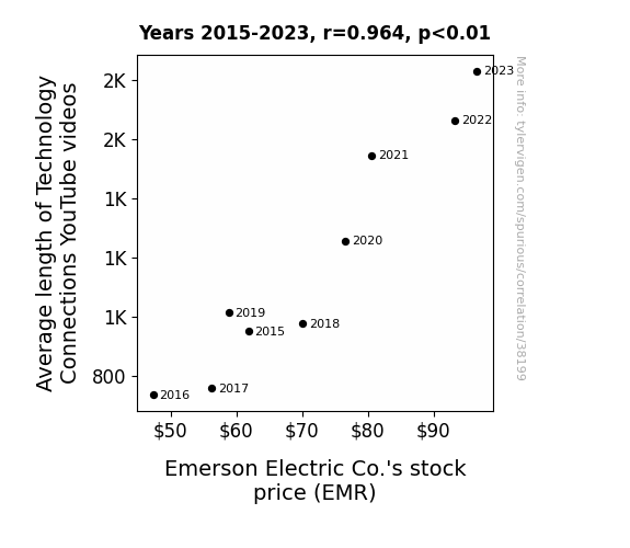 This means 92.9% of the change in the one variable (i.e., Emerson Electric Co.'s stock price (EMR)) is predictable based on the change in the other (i.e., Average length of Technology Connections YouTube videos) over the 9 years from 2015 through 2023.