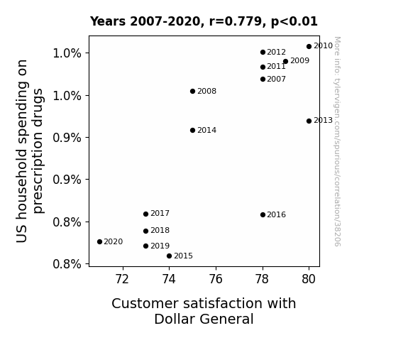 This means 60.7% of the change in the one variable (i.e., Customer satisfaction with Dollar General) is predictable based on the change in the other (i.e., US household spending on prescription drugs) over the 14 years from 2007 through 2020.