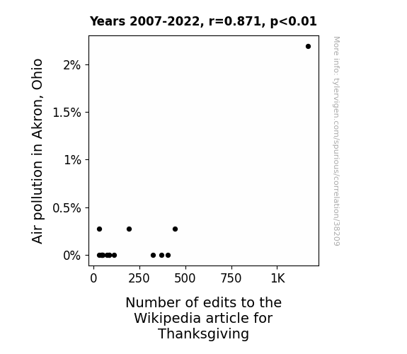 This means 75.9% of the change in the one variable (i.e., Number of edits to the Wikipedia article for Thanksgiving) is predictable based on the change in the other (i.e., Air pollution in Akron, Ohio) over the 16 years from 2007 through 2022.