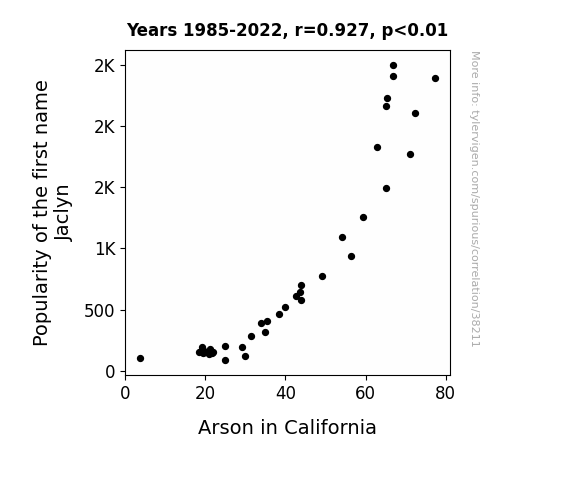This means 86% of the change in the one variable (i.e., Arson in California) is predictable based on the change in the other (i.e., Popularity of the first name Jaclyn) over the 38 years from 1985 through 2022.