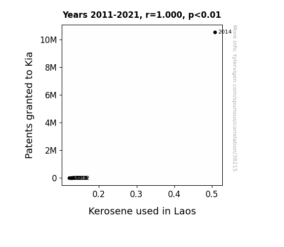 This means 100% of the change in the one variable (i.e., Kerosene used in Laos) is predictable based on the change in the other (i.e., Patents granted to Kia) over the 11 years from 2011 through 2021.