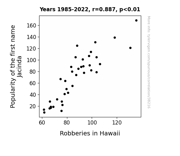 This means 78.7% of the change in the one variable (i.e., Robberies in Hawaii) is predictable based on the change in the other (i.e., Popularity of the first name Jacinda) over the 38 years from 1985 through 2022.