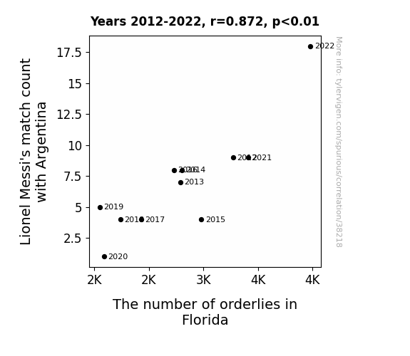 This means 76% of the change in the one variable (i.e., The number of orderlies in Florida) is predictable based on the change in the other (i.e., Lionel Messi's match count with Argentina) over the 11 years from 2012 through 2022.